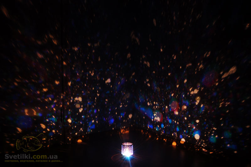 Компактный проектор, проецирует на стены и потолок узоры, похожие на звездное небо. Два режима подсветки: белый спокойный свет и разноцветные, хаотично меняющиеся звездные узоры. Режимы могут работать одновременно. Можно использовать как ночник.